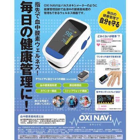 OXI NAVIはパルスオキシメーターのように健康管理目的で血液中の酸素飽和度の管理もできるウェルネス機器です。